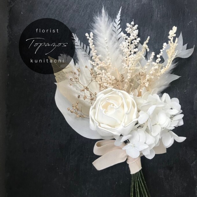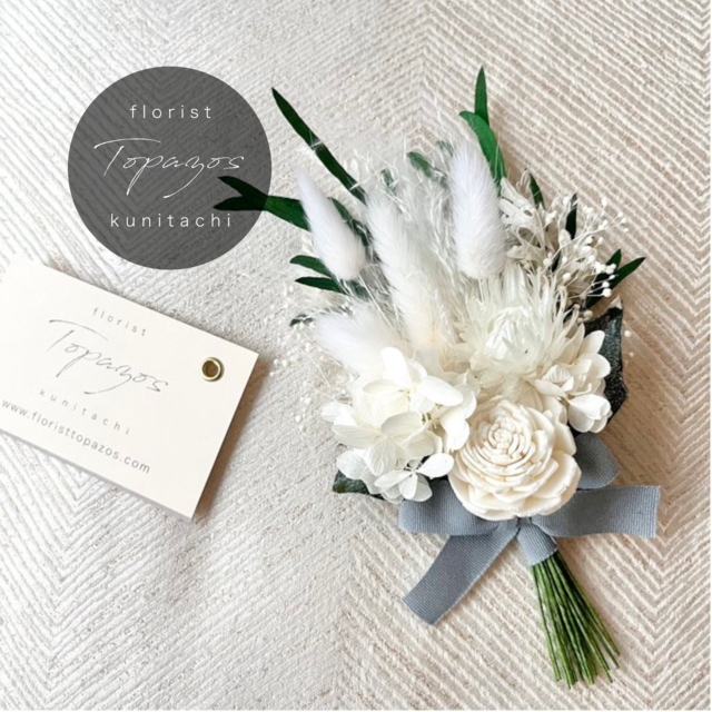 ・こちらは通常5営業日前後いただいてのご発送となります(お急ぎのお客様はご注文前にご相談くださいませ)。※複数ご購入の場合はさらに1〜2日いただくことがございます) ・【商品を複数点ご購入の方はこちらをご覧ください】(送料についてのお知らせページ) https://www.floristtopazos.com/items/90508547 白とグリーンだけでシンプルにまとめた、ナチュラルで洗練されたブーケのようなコサージュです。 白い花材は柔らかで清楚なかすみ草やラグラス、アジサイなどを、 グリーンにはユーカリニコリ(濃い緑)、ダスティミラー(シルバーグリーン)などを使っています。 (少々変更する場合があります) パールなどの素材は使わず、シンプル&ナチュラルに仕上げています。 セレモニーにぴったりな目立ちすぎない上品さを大切に、シンプルなスーツなどの装いに華を添えてくれるデザインです。 大人っぽく、ナチュラルかつ華やかなコサージュをお探しのかたに・・・。 ■贈りものにも、自宅での保管にも便利なギフトBOX&ラッピング込みの価格です。 ■留め具には、安全ピンとクリップ両方がついています。コサージュピン式より付けやすく、安全です。 ■ブートニア、ヘッドドレス(髪飾り)としてもお使いいただけます。 ■花束のようにお仕立てしてありますので、使用しない日は小さなグラスなどに挿して「ミニブーケ」としてお楽しみいただければ幸いです。 ■素材は、高品質のプリザーブドフラワー・ドライフラワーをそれぞれの特長をいかして使用しています。 ■Topazosでは、すべてのパーツをワイヤリング(※)しています。 これにより、 ・花や葉の自然な角度を楽しめ、花や茎の向きを微調整していただくことも可能 ・大きさの割に軽量で生地や体への負担も少ないです ・摘みあつめた花で作った花束のような、立体的で繊細なコサージュができあがります ※ワイヤリング:もともとついていた茎などをとりはずし、花材にあわせたワイヤーで一本一本茎を作りなおすこと。 ■ギフト用の場合 納品書は同梱せず、依頼人はご購入者さまのお名前でご手配いたします。 ■配送は、ヤマト運輸宅急便(地域別送料)でお届け致します。 〜このたびは、数ある素敵な作品の中からTopazosのお花に目をとめていただき、ありがとうございます。 ご不明な点はご遠慮なくお問い合わせください。〜 ・instaglam(ゆっくり更新)やっております。お花やアトリエまわりの雰囲気、そして店主の日々のつれづれ…ぜひご覧ください! https://www.instagram.com/florist_topazos #卒園式 #卒業式 #入園式 #入学式 #ママ #女性 #来賓 #ゲスト #式典 #ナチュラル #シンプル #コサージュ #プリザーブドフラワー #ドライフラワー #グリーン #ユーカリ #葉 #ブーケ #花束