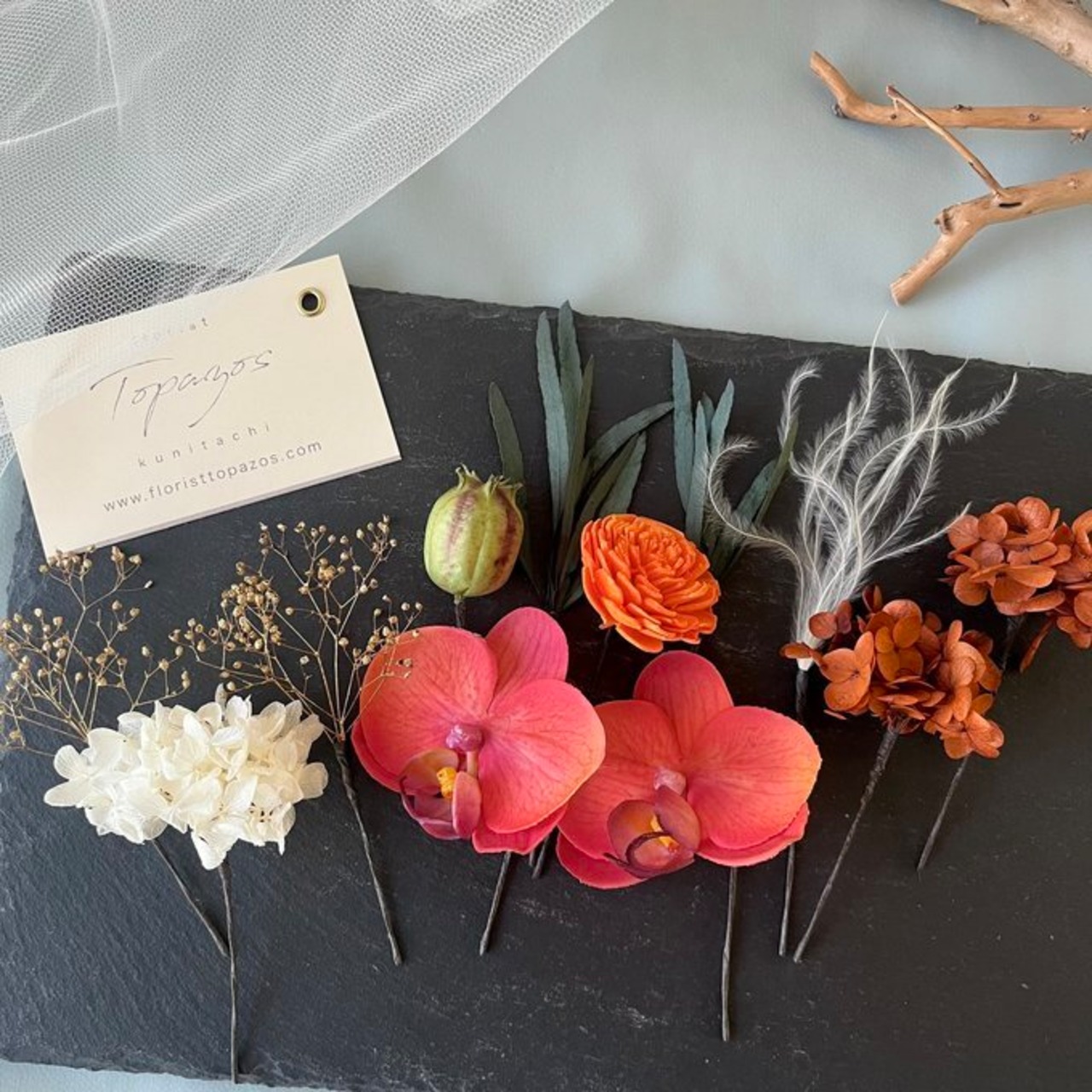 ■パーツは全て、ワイヤーで作った茎を専用のフローラルテープ(ダークブラウン)で巻き、自由に曲げられるかんざし状に加工してあります。散らしたり、まとめて配置したり、自由にアレンジ可能です!