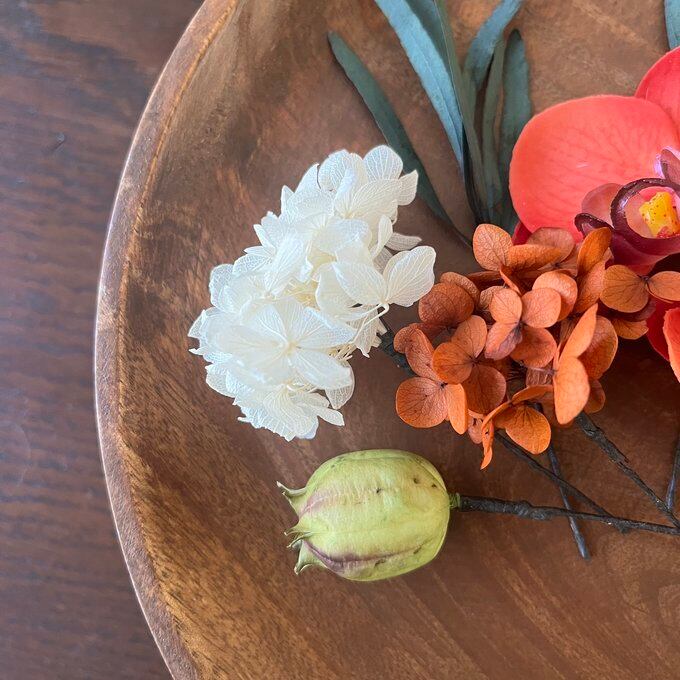 自然素材を使用していますので、花びらや実の少々の不揃いさ・落下等はご容赦願います。