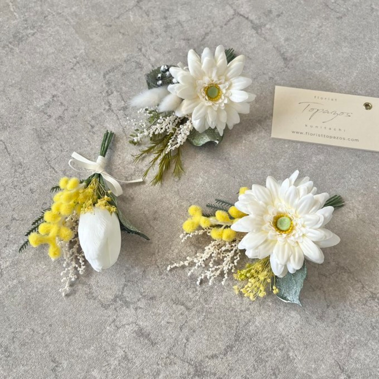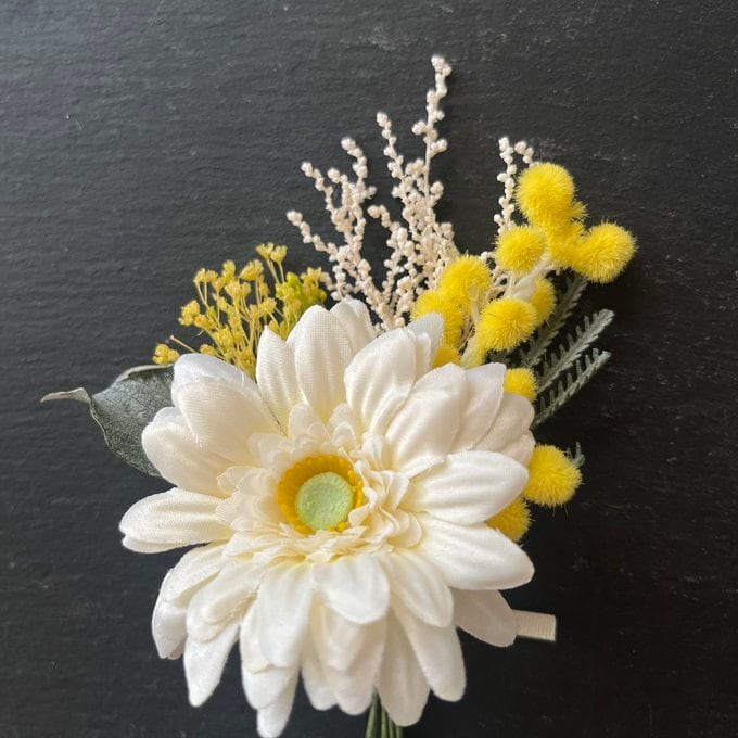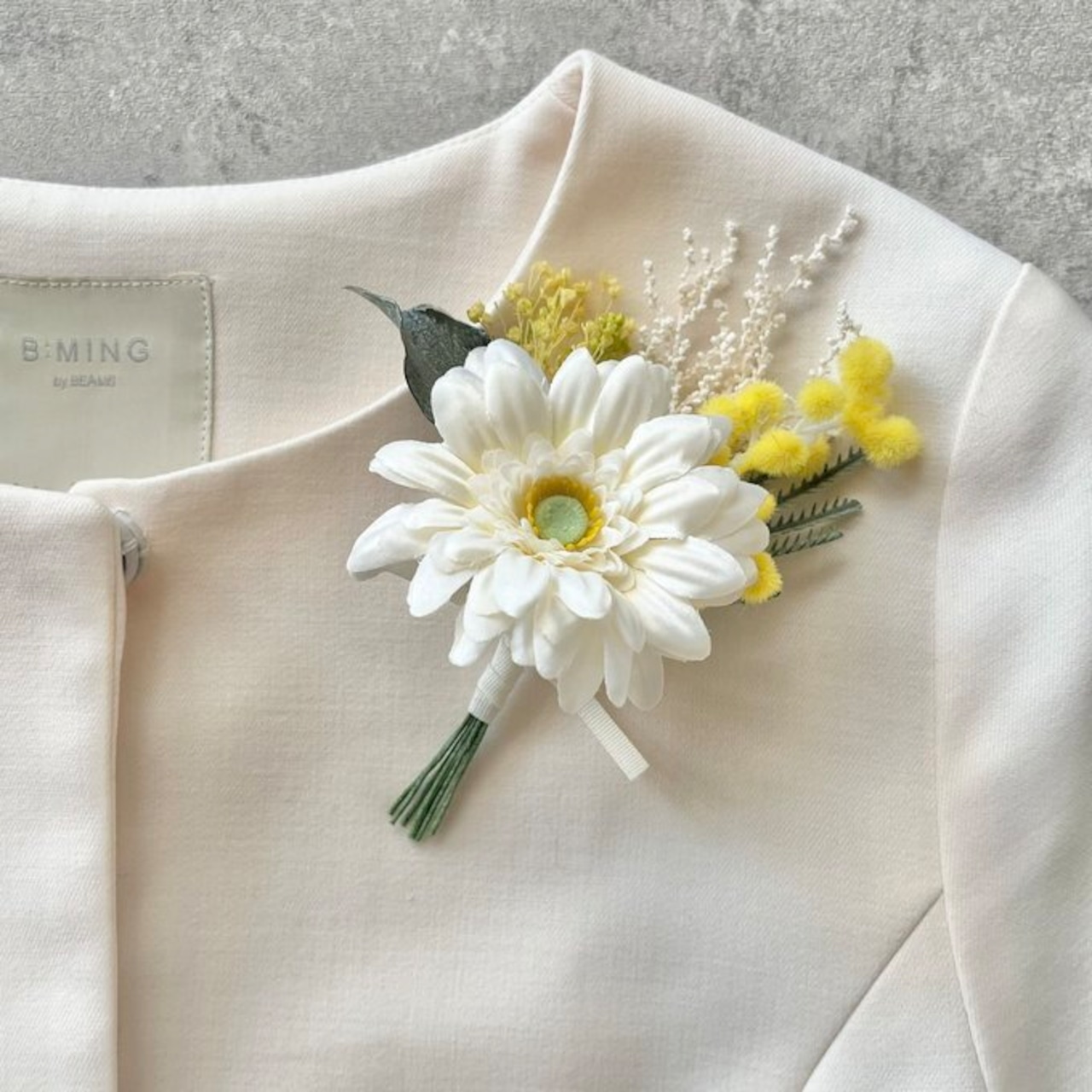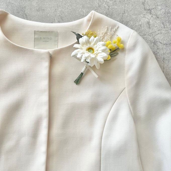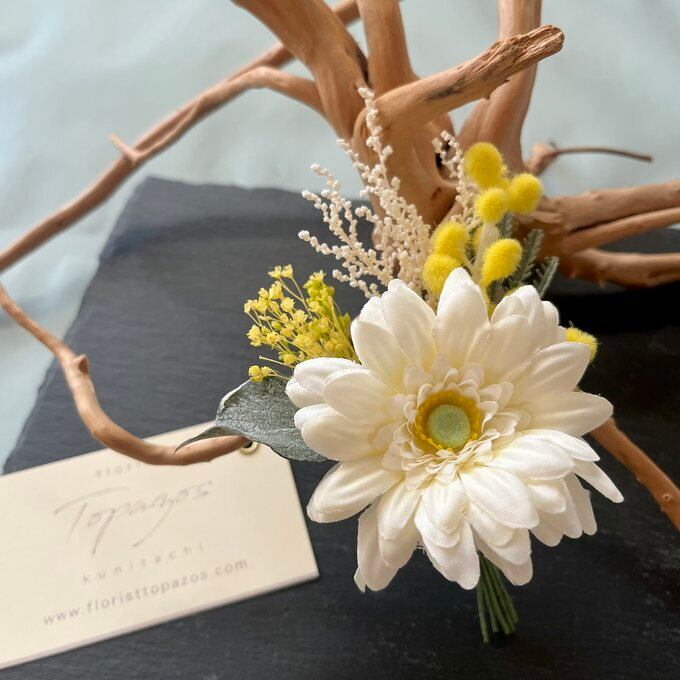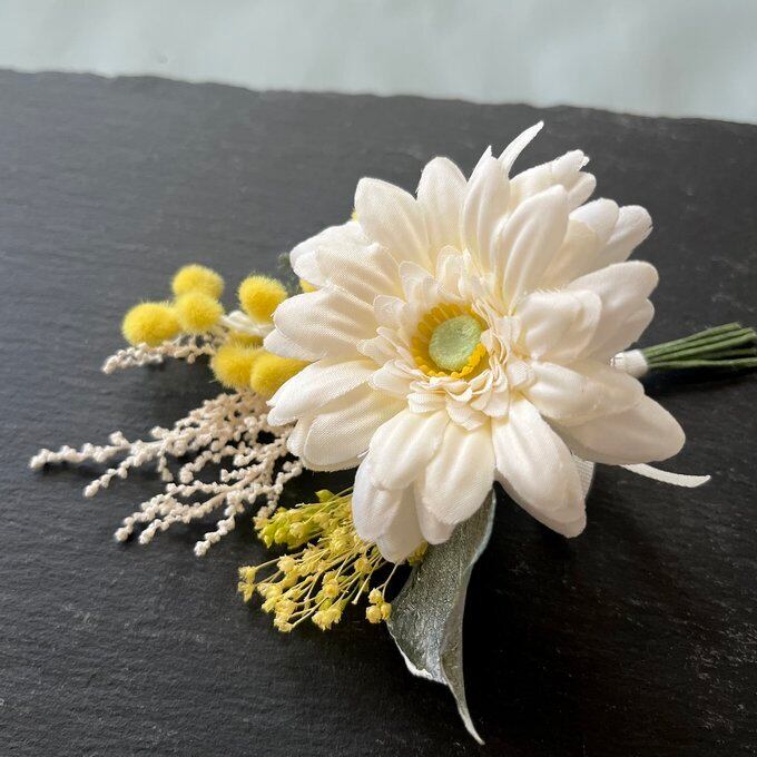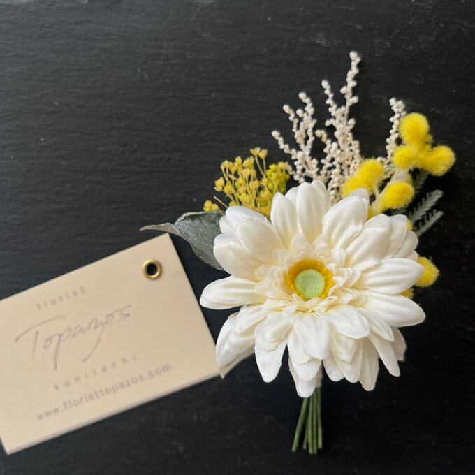 ホワイトガーベラ&ミモザのブーケコサージュ