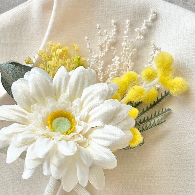 #卒園式 #卒業式 #入園式 #入学式 #ママ #女性 #来賓 #ゲスト #先生 #式典 #ナチュラル #シンプル #コサージュ #プリザーブドフラワー #ドライフラワー #アーティフィシャルフラワー #造花 #ブーケ #花束 #上品 #ガーベラ #ミモザ #白 #イエロー