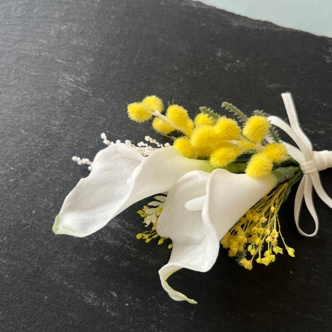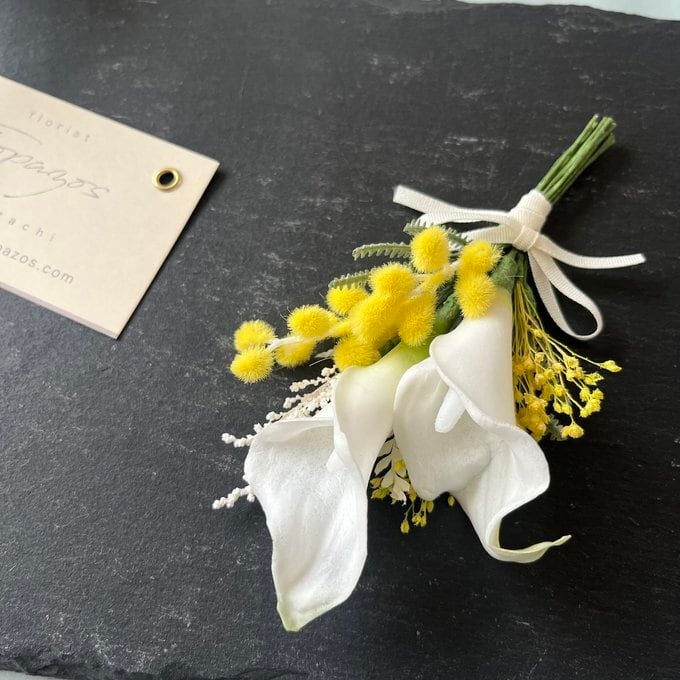 春らしさに心華やぐ、ミモザとカラーのコサージュ。